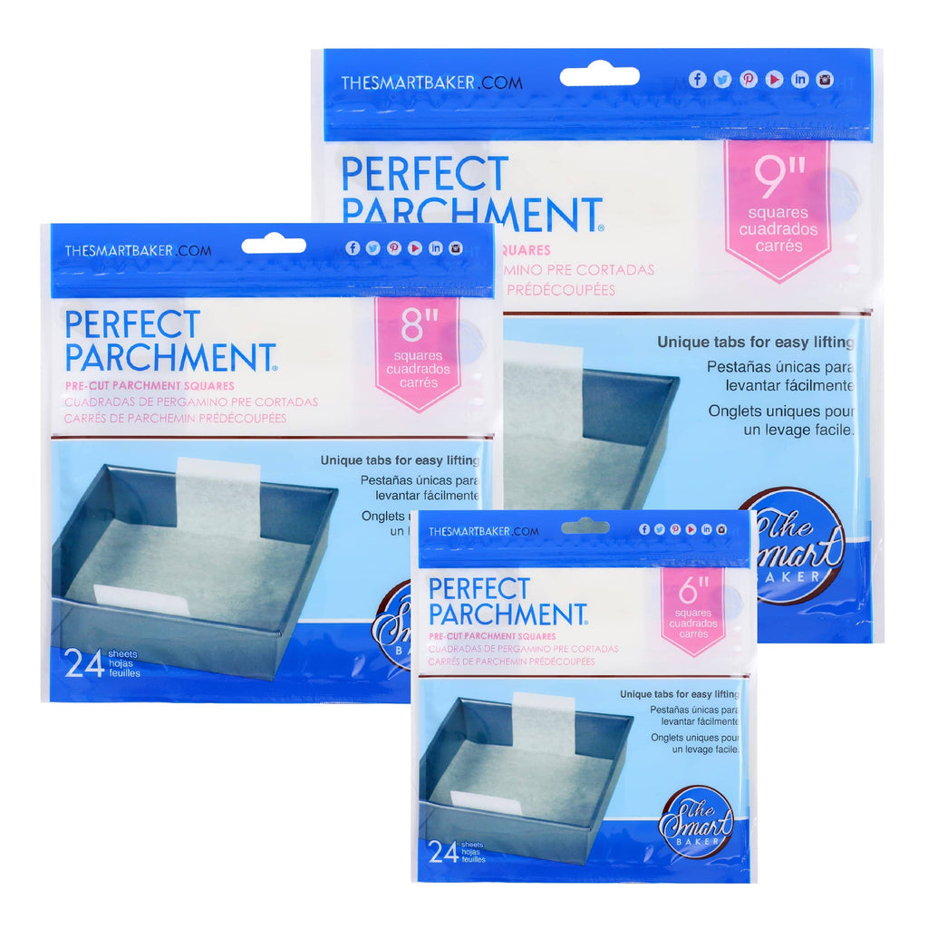 NO WASTE l NON-STICK l EASY CLEAN UP l OVEN SAFE UP TO 450°F Get them all! Buy the Bundle and Save! Sizes Included: 24 sheets per package (1) 6" Square Package - fits most 6 x 6 x 2 inch square cake pans (1) 8" Square Package - fits most 8 x 8 x 2 inch square cake pans (1) 9" Square Package - fit most 9 x 9 x 2 inch square cake pans (1) 6" Rounds Package - fits most 6 x 6 x 2 inch round cake pans (1) 8" Rounds Package - fits most 8 x 8 x 2 inch round cake pans (1) 9" Rounds Package - fit most 9 x 9 x 2 inch round cake pans (1) 10" Rounds Package - fits most 10 x 10 x 2 inch round cake pans (1) Small Sheets Package - fits most small cookie pans measuring 13.25 x 9.25 inches Each Parchment Sheets measure 12.5 x 8.5 inches (1) Medium Sheets Package - fits most medium cookie pans measuring 15.25 x 10.25 inches. Each Parchment Sheets measure 14.5 x 9.5 inches (1) Large Sheets Package - fits most large cookie pans measuring 17.25 x 11.5 inches Each Parchment Sheets measure 16.5 x 10.75 inches As Seen on Shark Tank! Forget the irritating roll of parchment paper! Our pre-cut parchment paper is cut to size so you can line your pans and get baking in no time allowing you to enjoy the benefits of cooking with parchment paper. You no longer have to trim that curled baking parchment paper and hope you cut it to the right size. The Smart Baker's Perfect Parchment is the right fit every time.