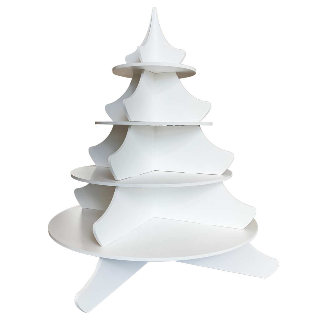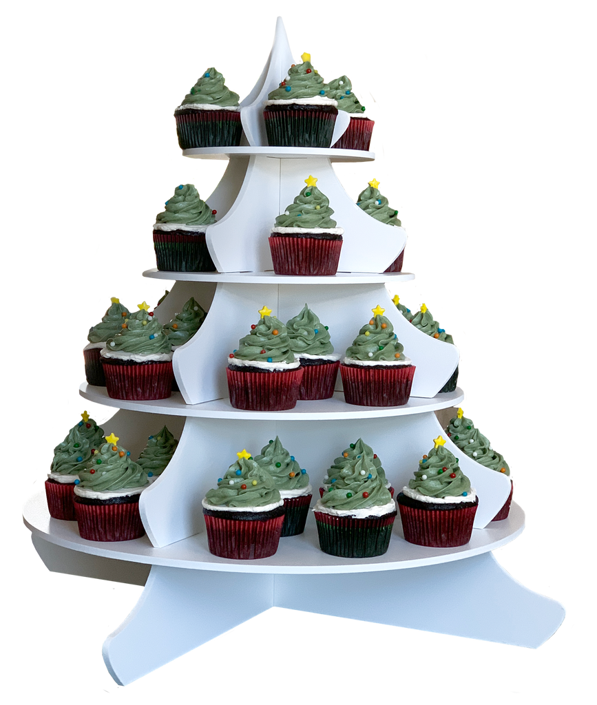 Made in the USA at our HQ in Rockledge, FL Produced from made in USA materials Manufactured on USA made equipment Perfect for Holiday get together. Proudly display your cupcakes, mini cupcakes, Hors d'oeuvre and more. Our tiered holiday cupcake holder will serve as the perfect centerpiece. Assembly: Interlocking pieces and included optional bases to allow for multiple configurations and flexibility Capacity: up to 48 Standard Cupcakes Material: 6mm White PVC Dimensions: Overall Dimensions: 18" wide x 21" tall Custom Storage and Carrying Tote Included